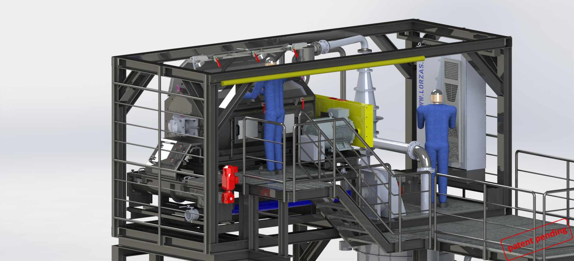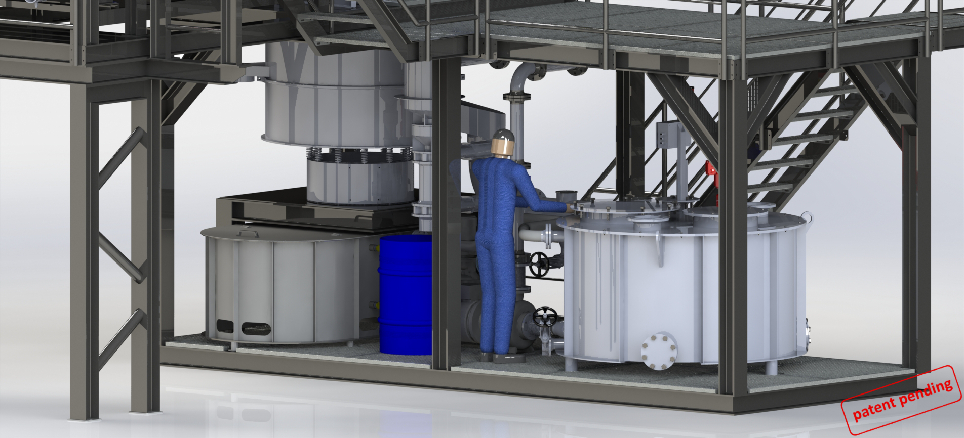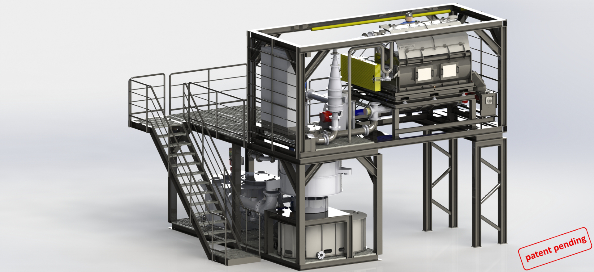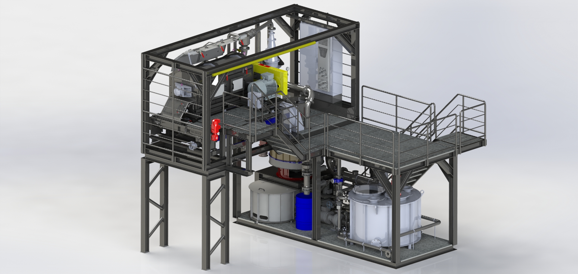 Mit diesem System können komplette Recyclinganlagen modular zusammengesetzt werden oder bereits bestehende Anlagen durch Nachrüstung eines Funktionsmoduls ertüchtigt werden.Im Bild: Eine Spül- und Trennstufe mit Anmaischbehälter, Hydrozyklontrennung und Trockenzentrifuge zur Nachrüstung einer bestehenden PET Recyclinganlage.